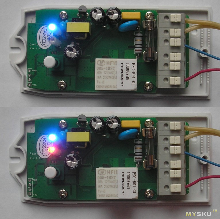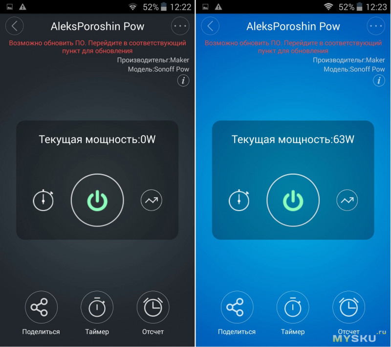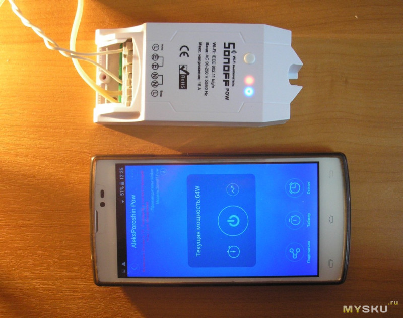 Можно включать и выключать нагрузку, нажимая на кнопочку. Три картинки: офлайн (не подключен к 220В), выключен, и включен. Лампочка 60-Ваттная. Во включенном состоянии измерил 63Вт (мощность зависит от напряжения в сети).