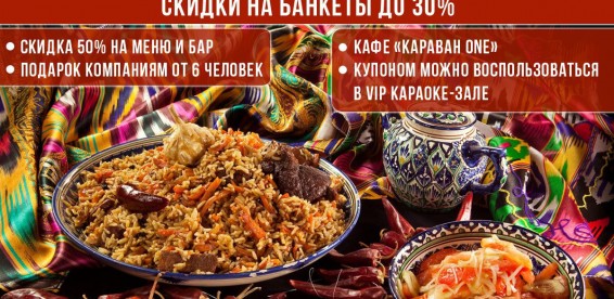 Купон дает право скидки 50% на основное меню и любые напитки в кафе «Караван One».— банкеты по купонам до 20 человек, на банкеты свыше 20 человек действуют скидки до 30% и скидка 100% на 2 часа работы диджея (подробности у администратора); — для компании от 6 человек паровой коктейль в подарок; — скидка 50% на все меню паровых коктейлей; — скидка 50% на меню и весь бар; — акция TO GO — скидка 50% на меню и напитки с собой; — скидка 20% на блюда на мангале; — купоном можно воспользоваться в VIP-кабинке; — купоном можно воспользоваться в караоке-зале; — скидка 100% на караоке в общем зале; — в наличии разливное пенное и новое пивное меню. Дополнительные условия:Согласно Федеральному закону от 22.11.1995 № 171-ФЗ, ст. 16, п. 2, продажа алкогольной продукции лицам, не достигшим 18 лет, запрещена. В случае сомнения в возрасте гостя, вас вправе попросить предъявить документ, удостоверяющий личность. Если у вас отсутствует документ, удостоверяющий личность, вам будет отказано в продаже алкогольной продукции, алкогольных коктейлей и пенного. Как работает купон: |