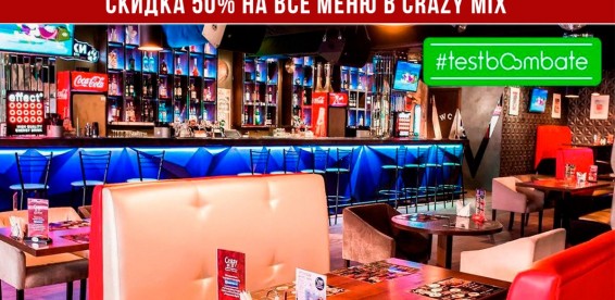Купон дает право скидки 50% на все меню и бар в Crazy MiX на Семеновской и Красных воротах во все дни.Дополнительные условия:Как работает купон:м. Красные ворота: пн-чт: с 12:00 до 00:00, пт: с 12:00 до 05:00, сб: с 16:00 до 05:00, вс: с 16:00 до 00:00, м. Семеновская: пт-сб: с 16:00 до 05:00, вс: с 16:00 до 00:00, пн-чт: с 12:00 до 00:00. |